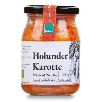 Was für eine schöne Kombination. Himmel (Holunder) und Erde (Karotten) sind in diesem Ferment vereint und bilden einen wunderbaren geschmacklichen Kontrast. Am besten als (lauwarmen) Kartoffel- oder Gemüsesalat genießen. Pur oder in Kombination mit anderen regionalen Gemüsen.