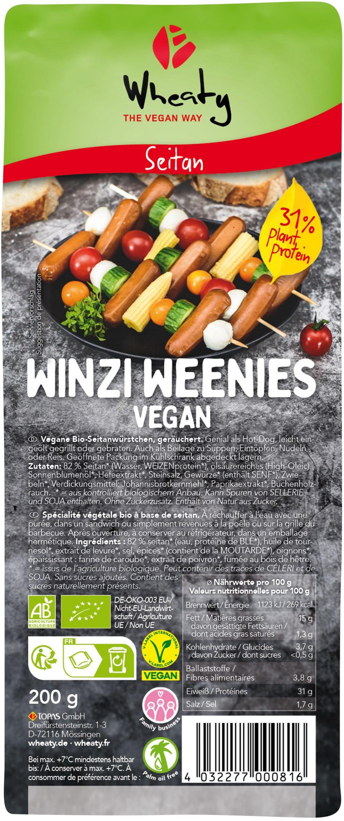 Die milden "kleinen Brüder" unserer Weenies sind besonders bei Kindern sehr beliebt. Geräucherte vegetarische Würstchen nach Hot-Dog-Art. Milder Geschmack, schonende Räucherung. Sowohl für Eintöpfe, Suppen und Soßen, als auch für die Pfanne geeignet.