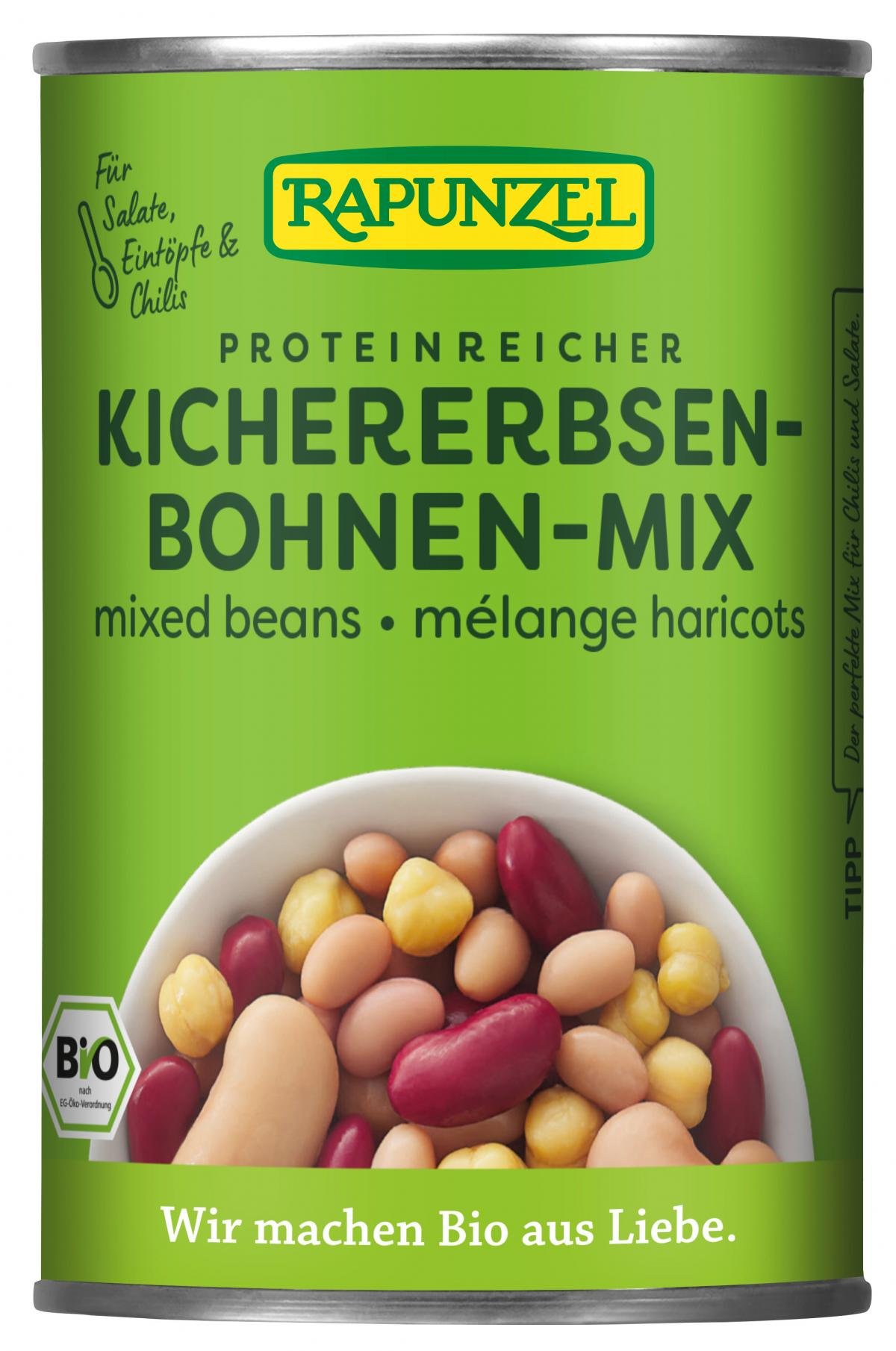 Eine fein abgestimmte Kombination aus milden roten und weißen Bohnen, sowie nussigen Kichererbsen. Fix & Fertig gekocht - für die schnelle Bio-Küche! Die Einweich- und Kochzeit entfällt, da die Bohnen schonend vorgegart sind.