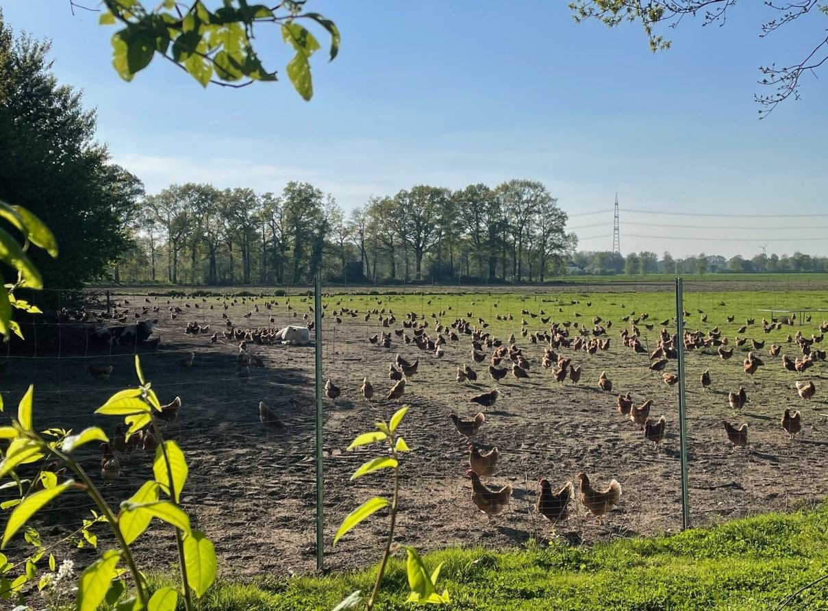 In unseren Hühnerwiesen stehen Bäume und Sträucher, die den Tieren Schatten und Schutz spenden, das kommt dem natürlichen Lebensraum des Huhns, dem Waldrand, sehr nah und schützt vor Greifvögeln.